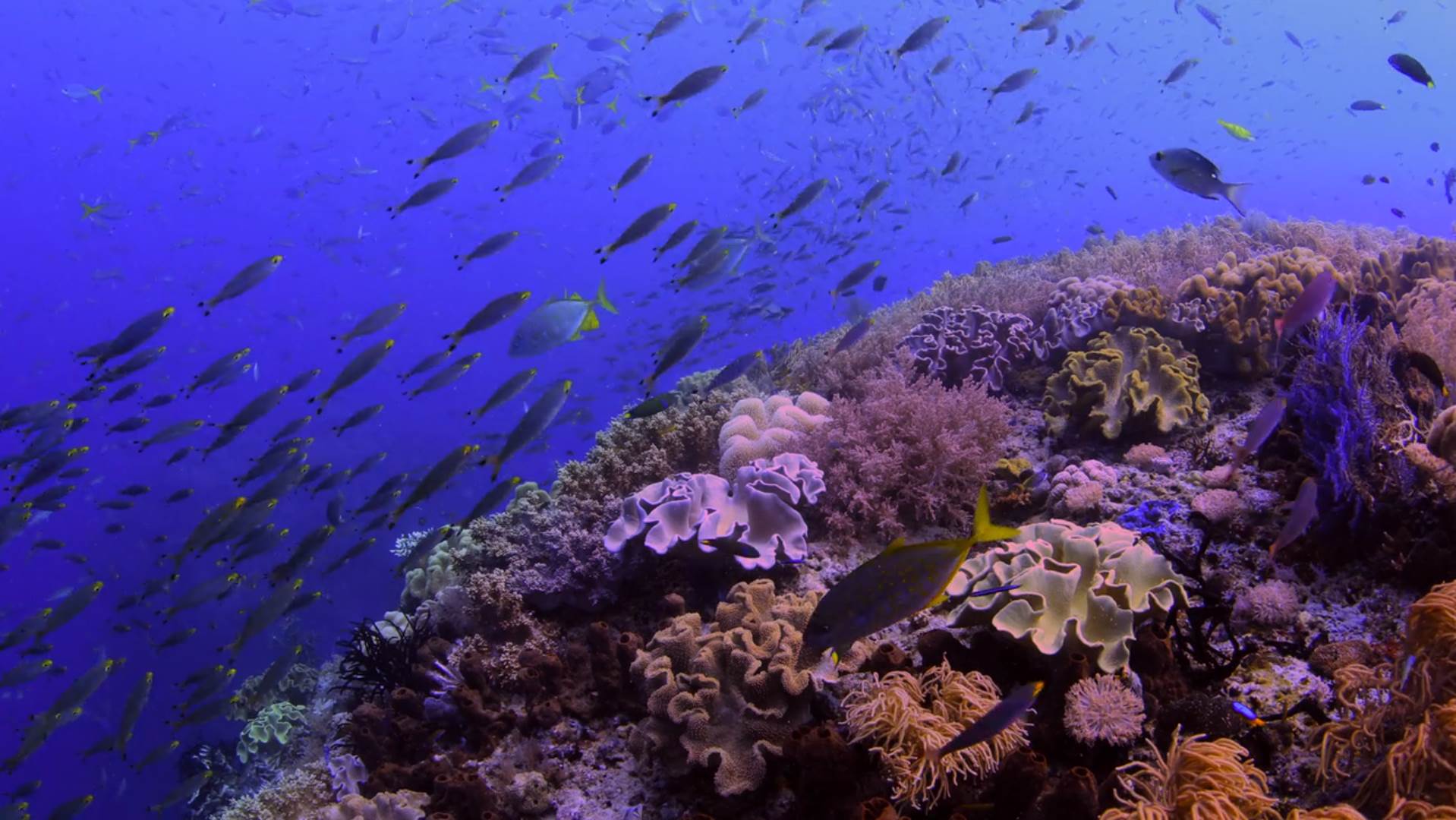 Das Riff fällt bereits in 30 m Entfernung in einer Tiefe von 9 m steil bis etwa 45 m ab. Du kannst am Riffhang in einer Tiefe bis zu 25 m entlang tauchen, bis du etwas ausserhalb der Bucht bist. Danach steigst du in flacheres Wasser auf, da liegen in 6 m Tiefe mehrere grosse Korallenblöcke, irgendwann sind sie wahrscheinlich einmal von der Küste abgebrochen, inzwischen sind sie wunderschön mit verschiedenen Schwämmen, Gorgonien und Korallen bewachsen. Mit etwas Glück triffst du hier auf kleine Fischschwärme die oft von Barrakudas gejagt werden. Eine sehr fischreiche Umgebung, benannt nach der sehr dunkelblauen Farbe des Meeres. Eine große Terrasse ist mit Korallenfächern, Elchgeweihkorallen, Federn, Stäbchen, Sternkorallen und Schwämmen bewachsen. Zwischen den Steinen verstecken sich unter anderem Großaugen- und Tigerzackenbarsche, Barrakudas und Skorpionfischen. Die durchschnittliche Tiefe beträgt 20 Meter, die maximale Tiefe 45 Meter